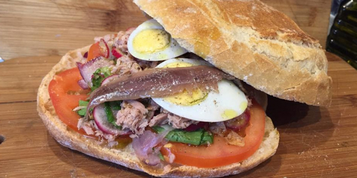 El pan bagnat es un bocata de la zona de Niza, que precisamente se realiza con los ingredientes de la ensalada nizarda. Se supone que el “bagnat” es en aceite de oliva, que tambien puede ser el de las conservas de bonito y anchoas. Es un bocata ideal para ir a la playa o al monte estos días tan propicios para las excursiones de fin de semana… y ¿por qué no?, también ideal para llevarlo a la oficina y manchar divinamente de aceite los informes del mes.